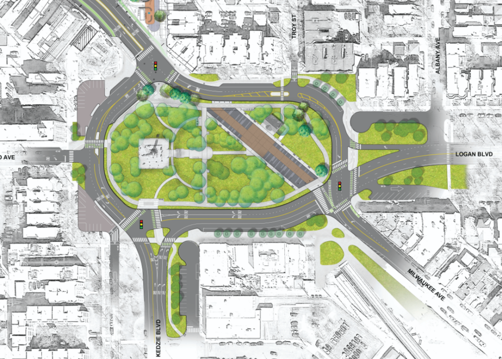 Milwaukee Avenue Reconstruction Project from Belmont to Logan Square: The Milwaukee Avenue project design includes pedestrian, bicycle, and bus stop improvements such as raised crosswalks, curb bump-outs, bike lanes, and reconfiguration at the square.