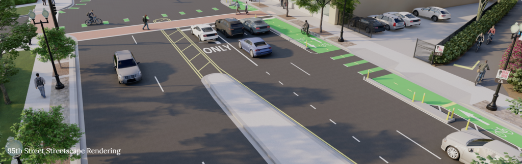 95th Street Streetscape Improvements from Wood Street to Ashland Avenue: The streetscape project is the fourth phase of the 95th Street streetscape project that started at Western Avenue and extends to Wood Street. Improvements include connections to the Major Taylor Trail across 95th Street, new sidewalks, new ADA ramps and crosswalks, and pedestrian refugee islands.